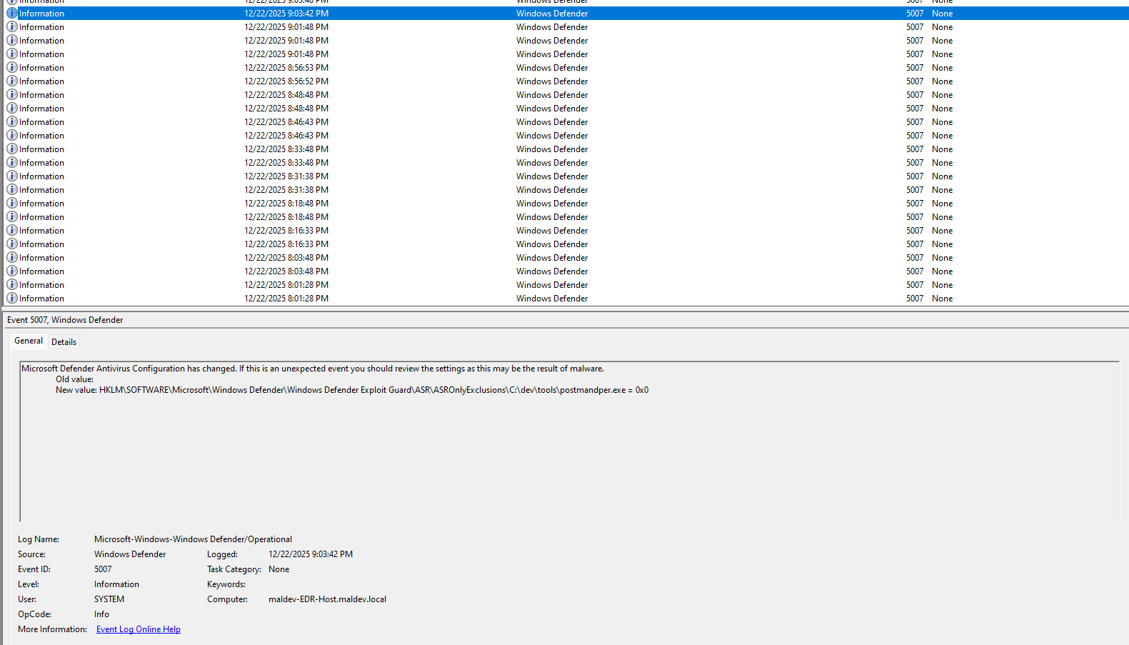 While on an engagement a while back I stumbled upon something that I had not seen mentioned before. When browsing the event logs of the machine that I had access to, I found something interesting under %SystemRoot%\System32\Winevt\Logs\Microsoft-Windows-Windows Defender%4Operational.evtx. When filtering for event ID 5007, I found the following line: