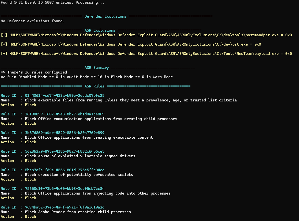 In order to speed up the process for gigs that require less stealth or with less mature security teams and setups, I created a PowerShell script that can parse the event logs and report exclusions and what rules are currently enabled on the machine along with their current state. This allows for quick wins and I have yet to see any security setups where this has generated an alert (yet…). The tool can be found in the following repo that I created for the purpose: